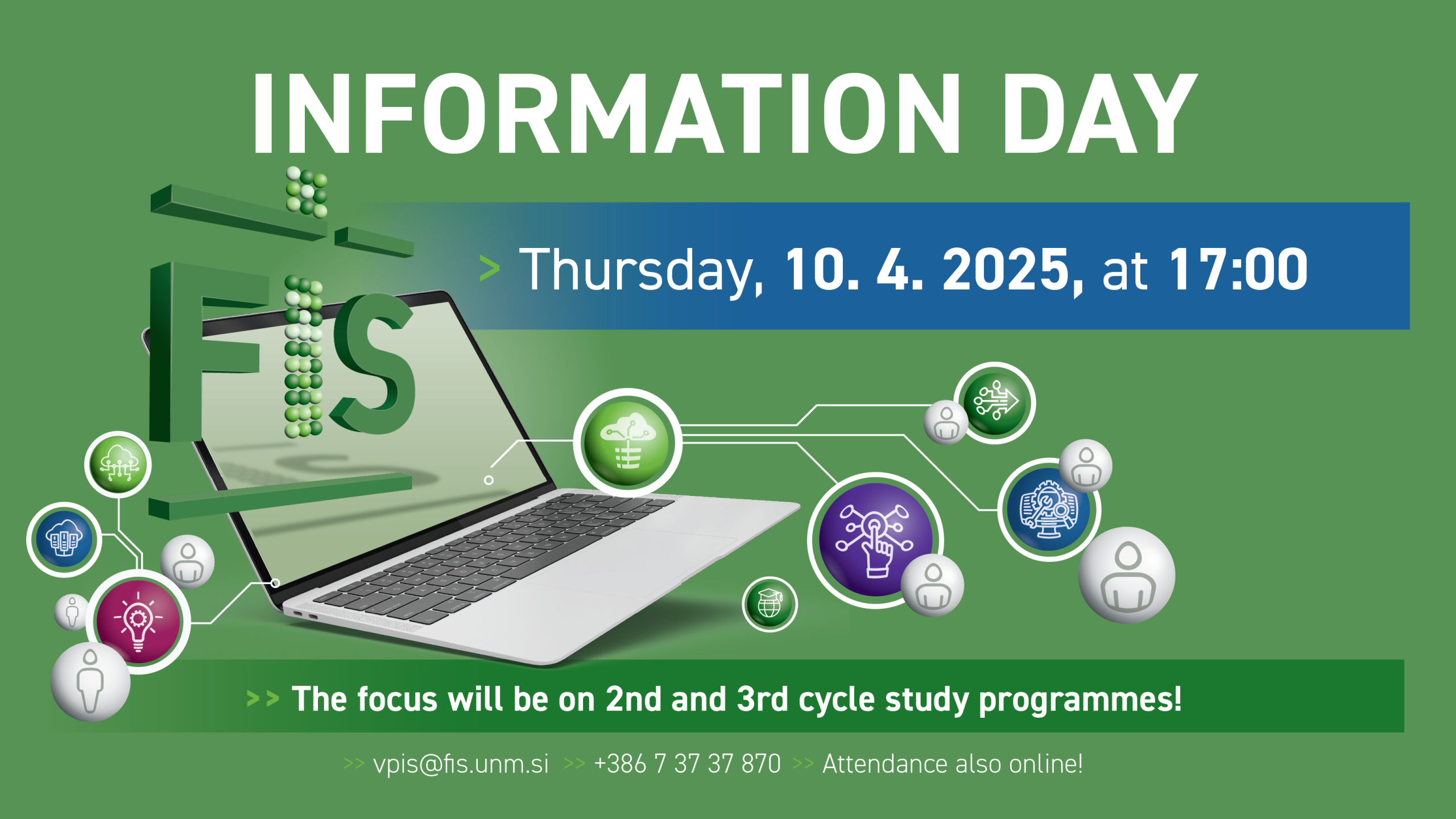 The Faculty of Information Studies in Novo mesto (FIS) invites you to our Information day, taking place on Thursday, 10 April 2025, at 17:00. This time, we will pay special attention on presenting our master’s and doctoral study programmes, for which the first application period opens on 1 April 2025.